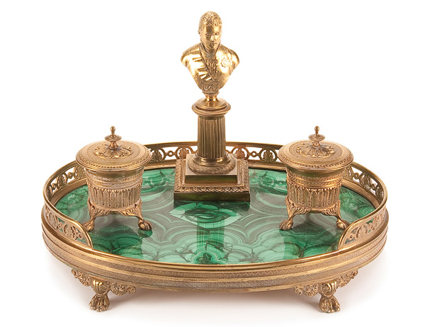 A RUSSIAN GILT BRONZE AND MALACHITE DESK SET, 19TH CENTURY. The oval malachite base resting in a gilt bronze oval frame set on four paw feet and with open rail. In the center atop a fluted column a gilt bronze bust of Tsar Alexander I and on either side matching inkwells of classical urn form banded with palmettos and resting on claw and ball feet and with hinged lids. Height 9 inches (23 cm), width 13 inches (33 cm).