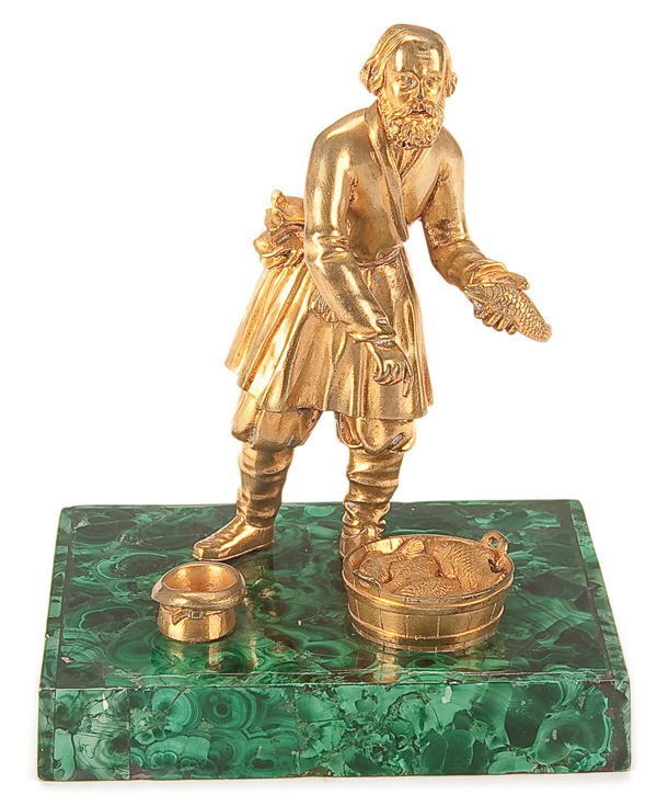 A RUSSIAN GILT BRONZE AND MALACHITE DESK ORNAMENT, 19TH CENTURY. Depicting a finely sculpted gilt bronze figure of a fishmonger, set on a veneered malachite base. Height 5.5 inches (14 cm).