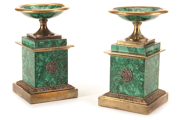 A PAIR OF RUSSIAN GILT BRONZE AND MALACHITE TAZZA, 19TH CENTURY. The fronts set with Imperial double-headed eagles. Height 7 inches (18 cm).