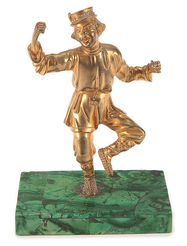 A RUSSIAN GILT BRONZE AND MALACHITE PAPERWEIGHT, 19TH CENTURY. The veneered malachite base set with a finely sculpted gilt bronze figure of a dancing peasant. Height 5 inches (12.7 cm).