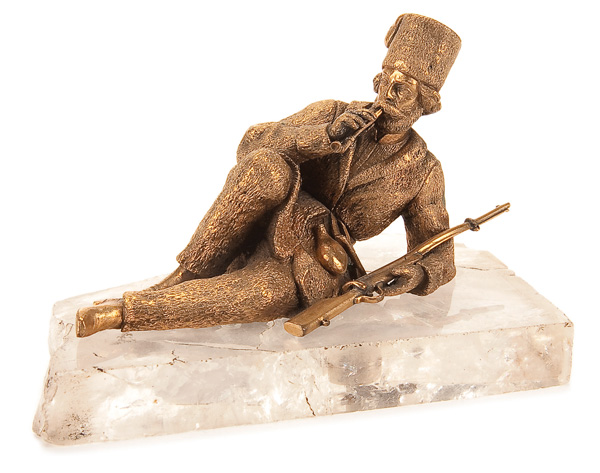 A RUSSIAN GILT BRONZE AND ROCK CRYSTAL PAPERWEIGHT, 19TH CENTURY. The rock crystal base mounted with a finely sculpted gilt bronze figure of a reclining soldier smoking a pipe. Height 3.375 inches (9 cm), length 5.25 inches (13.2 cm).