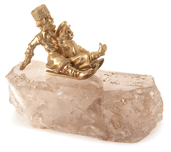 AN IMPRESSIVE RUSSIAN GILT BRONZE AND ROCK CRYSTAL DESK ORNAMENT, 19TH CENTURY. The polished and rough hewned rock crystal base mounted with a gilt bronze figural grouping of a father and son sledding. Height 5.25 inches (13.2 cm), length 7.25 inches (18.4 cm).