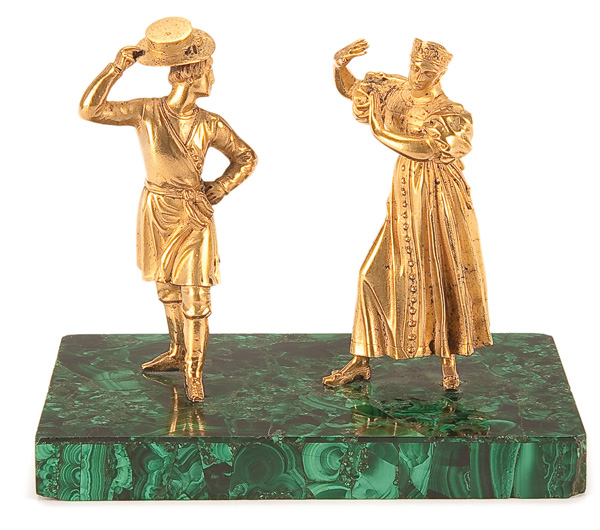 A RUSSIAN GILT BRONZE AND MALACHITE DESK ORNAMENT, FIRST HALF OF THE 19TH CENTURY. The malachite veneered base mounted with finely sculpted gilt bronze figures of a dancing man and woman. Height 6 inches (15.2 cm), length 7 inches (17.8 cm).