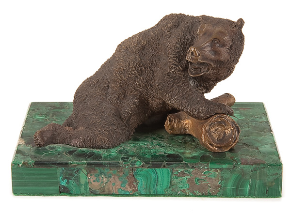 A RUSSIAN BRONZE AND MALACHITE DESK ORNAMENT, 19TH CENTURY. The veneered malachite base mounted with a finely sculpted bear resting on a gilt bronze log. Height 4.25 inches (10.8 cm), length 6-3/8 inches (16.3 cm).