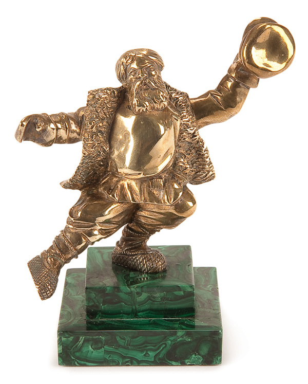 A RUSSIAN BRONZE AND MALACHITE DESK ORNAMENT, 20TH CENTURY. The stepped veneered malachite base mounted with a sculpted figure of a dancing peasant. Height 5 inches (12.7 cm), length 4.5 inches (11.4 cm).