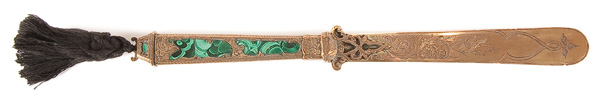 A RUSSIAN MALACHITE AND GILT BRONZE MOUNTED PAPER KNIFE, 19TH CENTURY. Letter opener length 12.75 inches (32.4 cm). Together with a malachite pencil, with some losses.