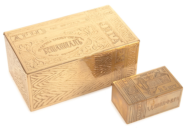 A PAIR OF ENGRAVED RUSSIAN TROMPE L'OEIL CIGAR AND PAPER BOXES, 19TH CENTURY The polished brass rectangular form boxes with hinged lids and the sides engraved with banding simulating tax labels. Lengths 7.5 inches (19 cm) and 3.75 inches (9.5 cm).