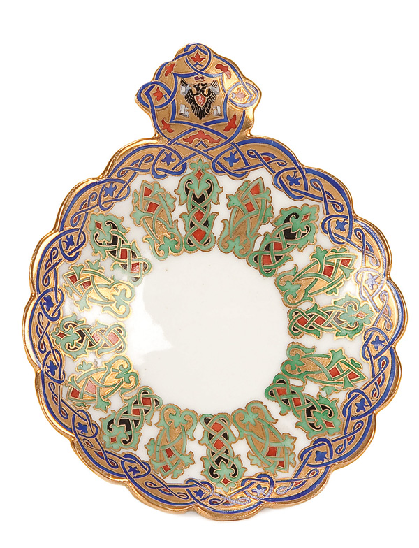 A VERY FINE IMPERIAL PROCELAIN FACTORY CHARKA, PERIOD OF NICHOLAS I. Raised on a circular rim, the concave dish with scalloped rim and trefoil handle displaying the Imperial Double Headed Eagle against a gilt ground and within a strapwork reserve. The borders and interior similarly decorated. The underside marked with blue underglaze cypher of Nicholas I under the Imperial crown. Length 5 inches (12.8cm).