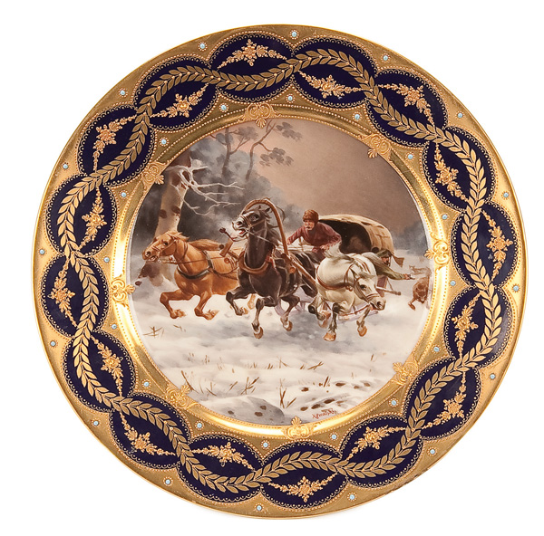 A VERY FINE HAND PAINTED VIENNA CABNET PLATE, 19TH CENTURY. The central reserve with hand painted winter scene of a troika being chased by wolves, artist signed Kowalski and the borders with ornate raised gilt decoration against a cobalt blue ground interspersed with turquoise cabochons. Underside of plate with crown mark. Diameter 9.4 inches (24cm).