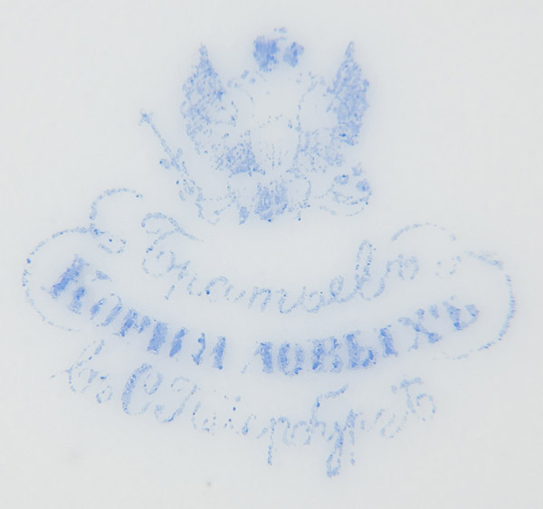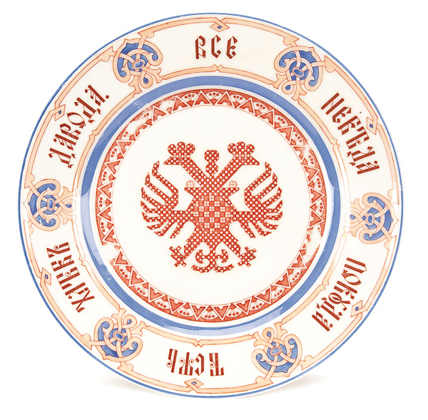 A RUSSIAN PORCELAIN PROVERBS PLATE, KORNILOV, CIRCA 1875. The central reserve with faux embroidered Imperial Double Headed Eagle, the rim with strapwork and inscribed in Slavonic with the proverb, 'If you have bread and water, you have no worries'. The underside of plate with blue factory mark of Kornilov under the Imperial Warrant. Diameter 9.5 inches (24cm).
