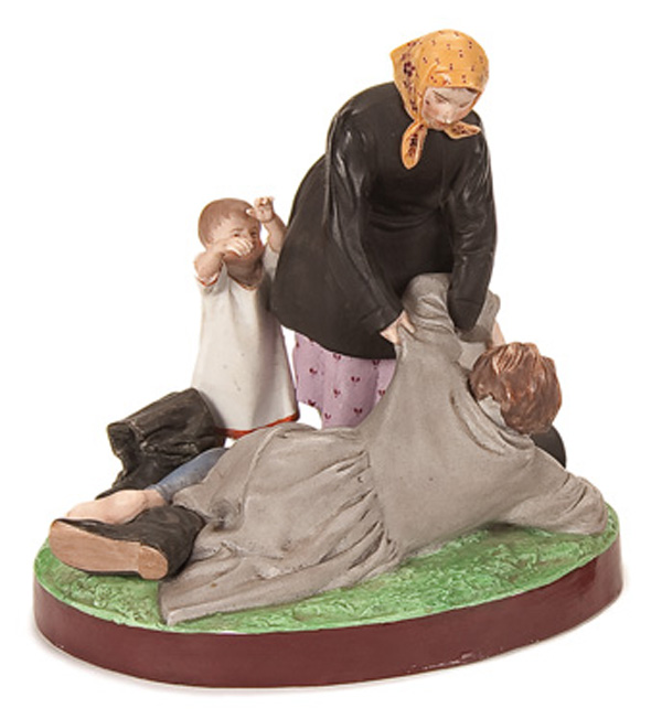 A RUSSIAN BISQUE PORCELAIN GROUP of a woman and child with drunk husband, Gardner Manufactory, 19th century. Impressed Gardner mark and red Gardner stamp and #122. Height 6.8 inches (17 cm).