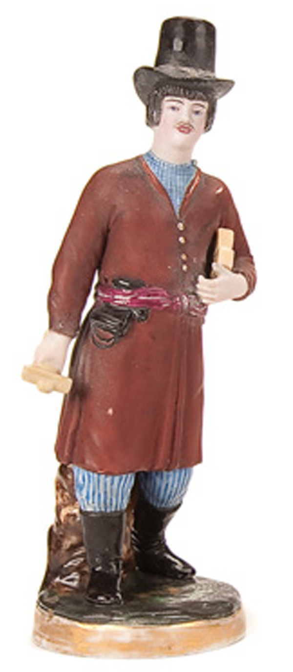 A RUSSIAN BISQUE PORCELAIN FIGURE of a peasant sharpening a scythe, circa 1820-1850. Blue underglaze Latin G for Gardner and incised #2. Height 8 inches (20.3 cm).