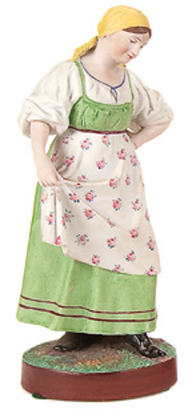 A RUSSIAN BISQUE PORCELAIN FIGURE of a milk maid, 19th century. Impressed Gardner mark and with red Gardner stamp under the Imperial Warrant and #3. Height 7.75 inches (19.7 cm).