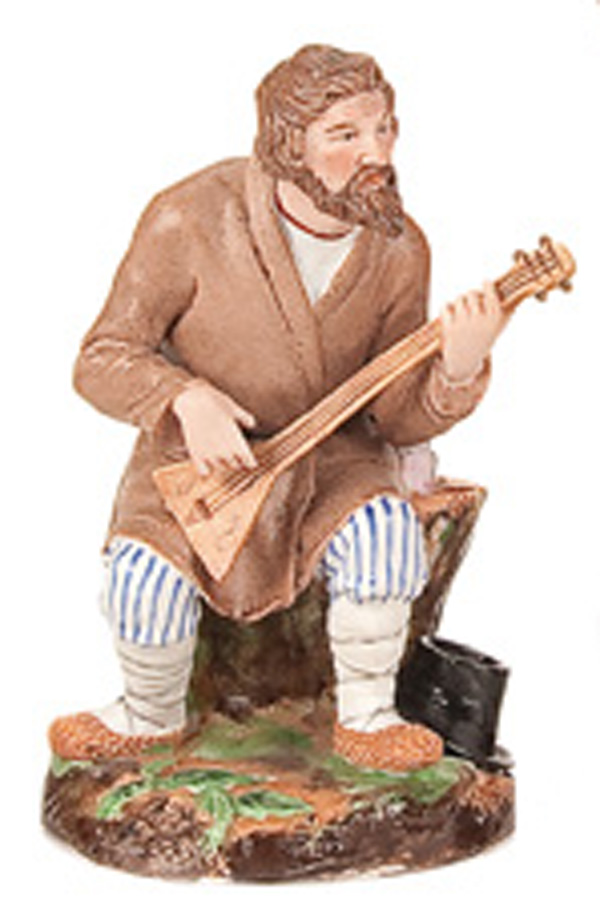 A RUSSIAN BISQUE PORCELAIN FIGURINE of a balalaika player, 19th century. Incised Popov mark. Height 5.75 inches (14.6 cm).