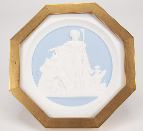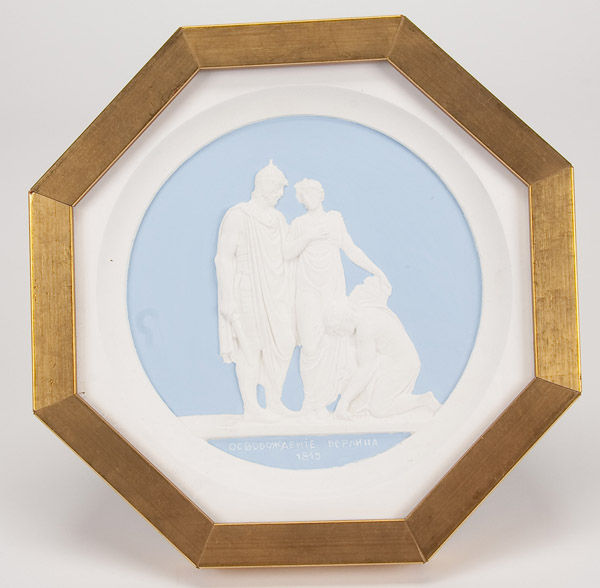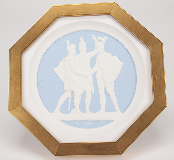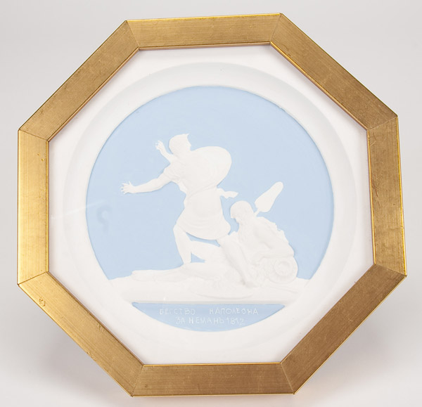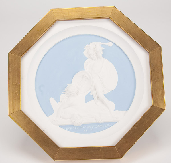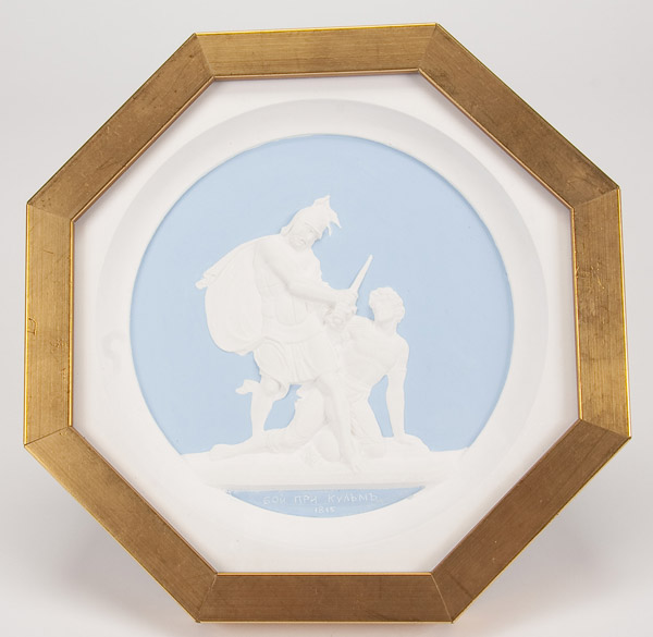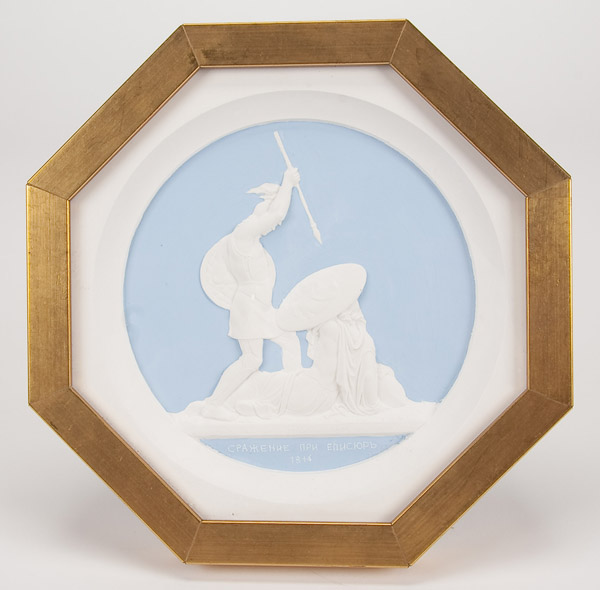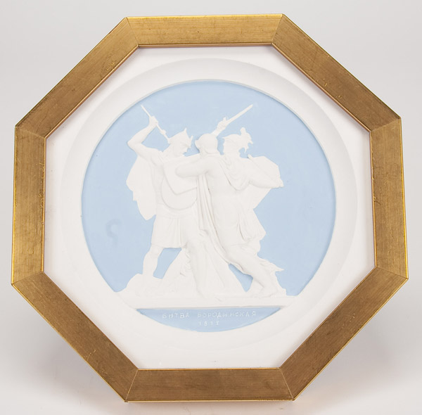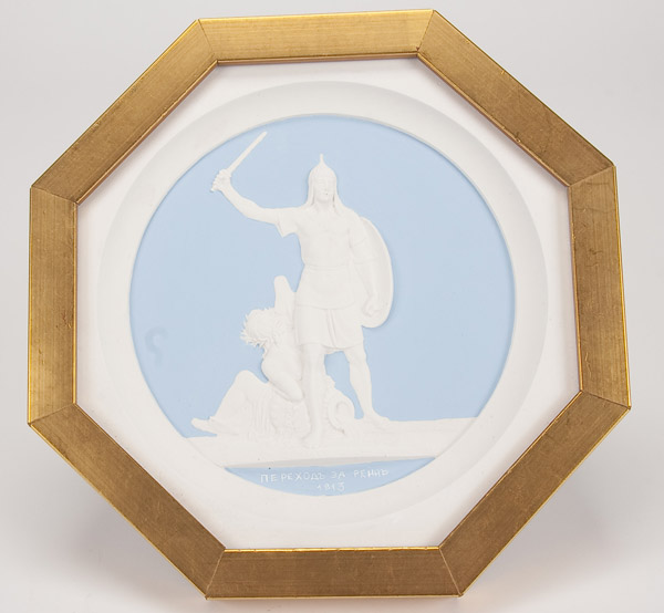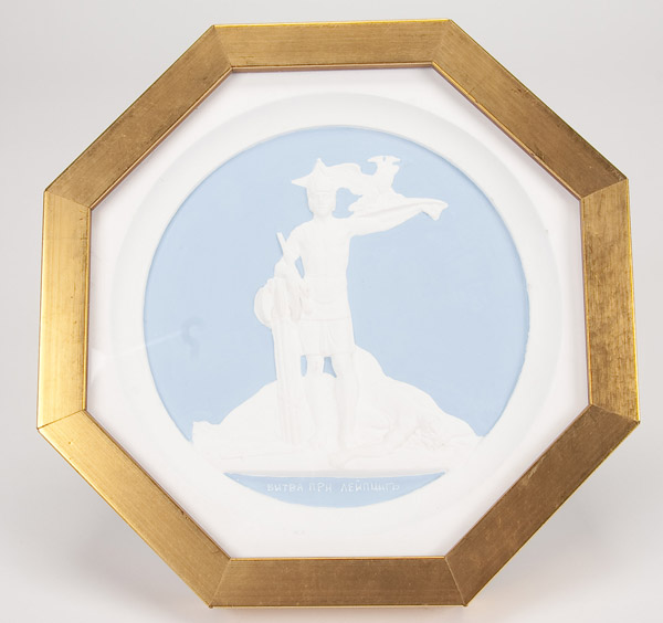 A SET OF TEN PLASTER CAST MEDALLION PLAQUES after Count Theodore Petrovich Tolstoy, 1783-1873. The ten octagonal shape polychrome relief sculpted plaques with various allegorical scenes commemorating the campaigns against Napoleon and contained in matching glazed gilt frames. Width 8 inches (20.3 cm) each.
