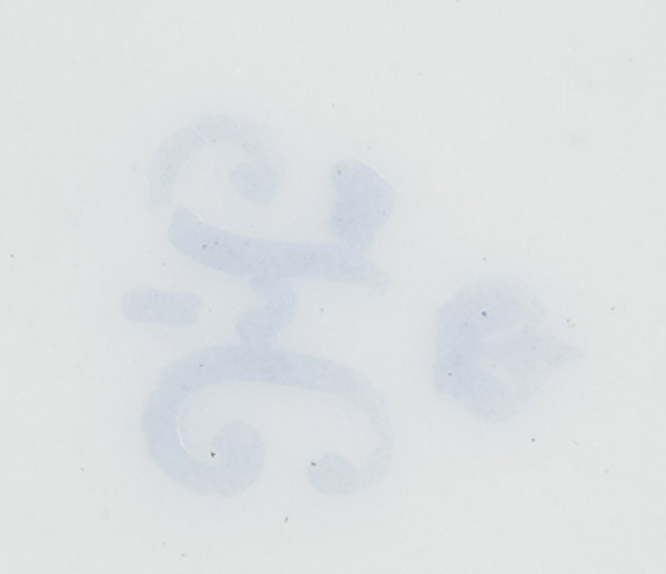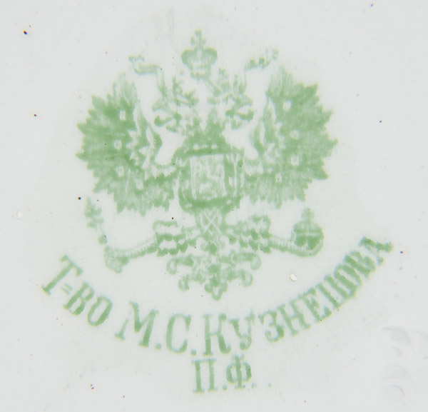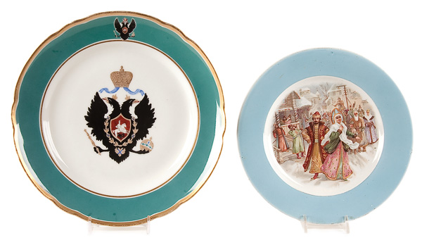 A RUSSIAN IMPERIAL PORCELAIN FACTORY PLATE with two double headed Imperial eagles, teal borders and scalloped rim with gilt edging. Verso with mark of Nicholas I, 1796-1855. Diameter 9.25 inches (23.5 cm), Together with a pictoral transferware porcelain plate with blue border and mark of Kuznetsov under the Imperial warrant. Diameter 7.8 inches (20 cm).