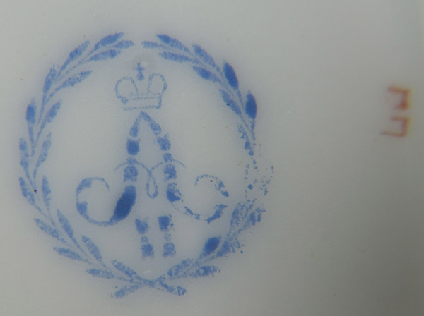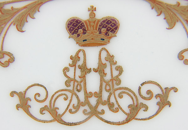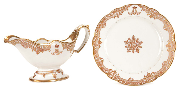TWO PIECES OF IMPERIAL PORCELAIN FACTORY DINNERWARE comprising a gravy boat and plate, from the Banquet Service of Tsarevitch Alexander Alexandrovich (later Alexander III). With scalloped edges and ornate gilt decoration and emblazoned with the cypher of the Tsarevitch beneath the Imperial crown. Underside of gravy boat stamped in blue with the cypher of Tsar Alexander II within a wreath. Gravy boat length 10.8 inches (28 cm), plate diameter 8.8 inches (22.5 cm)