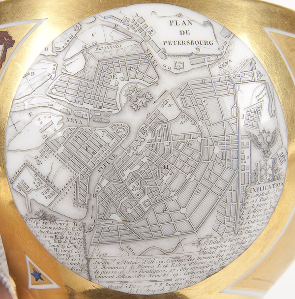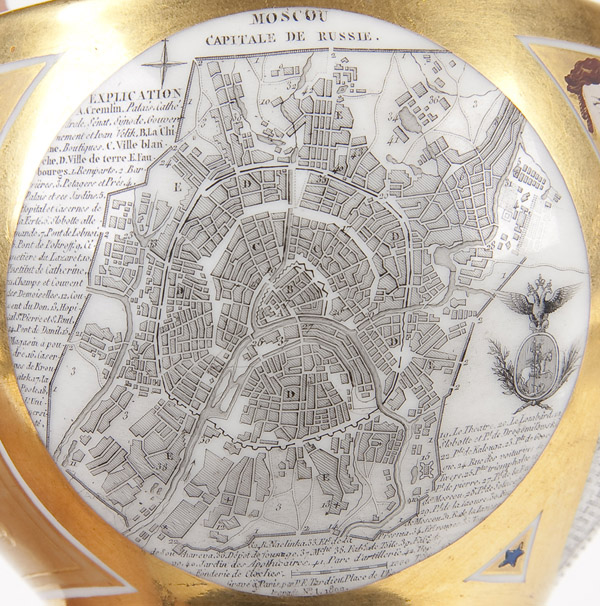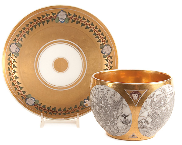 A FINE AND IMPORTANT PORCELAIN CARTOGRAPHIC BREAKFAST CUP AND SAUCER by The Schoelcher Factory, France, first quarter of the 19th century. The cup of rounded form printed with two circular maps of Moscow and St. Petersburg dated 1809 against a matte and burnished gold ground decorated with flower heads and with gilded interior. The saucer with similar ciselE decoration and with a band of holly interspersed with masks. Underbase of cup inscribed in gold 'Schoelcher' and the saucer underbase incised with a 'C'. Cup height 3 inches (7.6 cm), saucer diameter 6.2 inches (15.7 cm).
