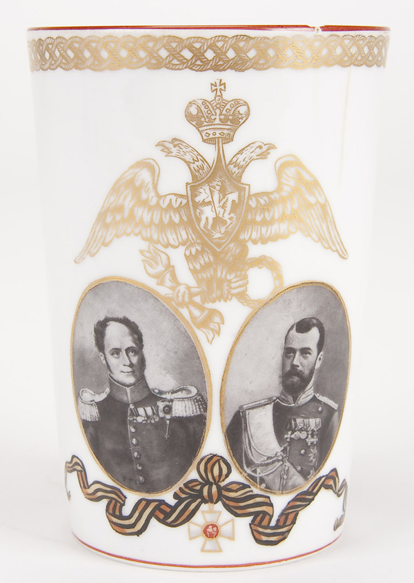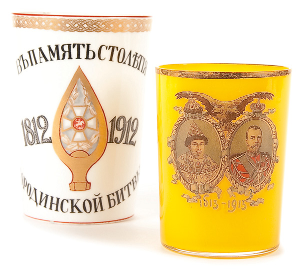 A PAIR OF IMPERIAL RUSSIAN GLASS COMMEMORATIVE BEAKERS The first commemorating the victory at Borodino, one side depicting potraits of Nicholas I and Nicholas II beneath the Imperial double headed eagle and with the order of St. George between them. The opposite side with the dates 1812-1912 with St. George standard. Together with a Romanov tricentenary glass beaker. Height 4.75 inches (12.1 cm) and 3.75 inches (9.5 cm).