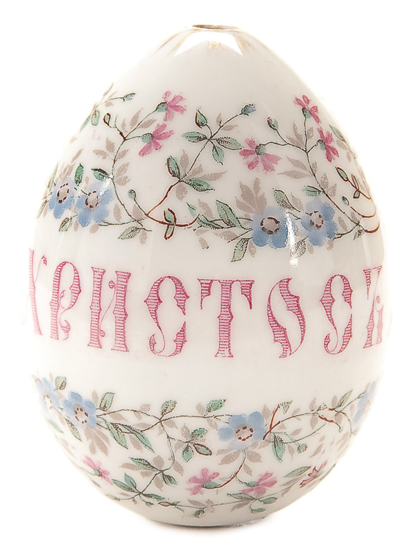 A RUSSIAN PORCELAIN EASTER EGG, CIRCA 1890 the top and bottom banded with blooming florals and the center inscribed in Cyrillic 'Christ Has Risen'. Height 3.75 inches (9.5 cm).