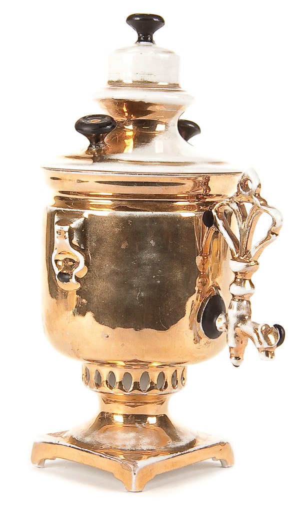 AN INTERESTING RUSSIAN GILT PORCELAIN FIGURAL COVERED CUP IN THE FORM OF A SAMOVAR Underbase with Kuznetsov factory mark beneath the Imperial warrant, 19th century Height 7.75 inches (19.8 cm).