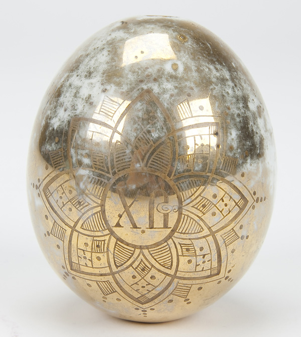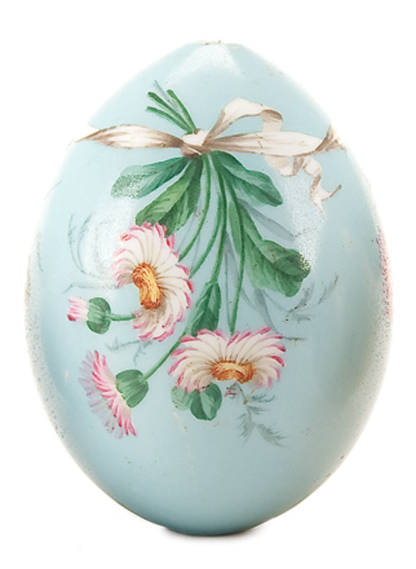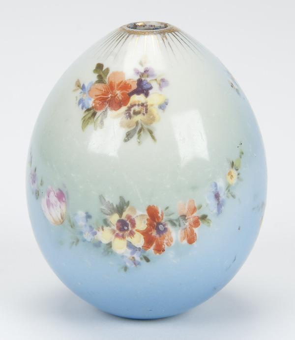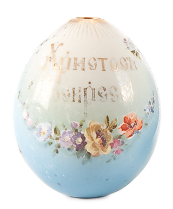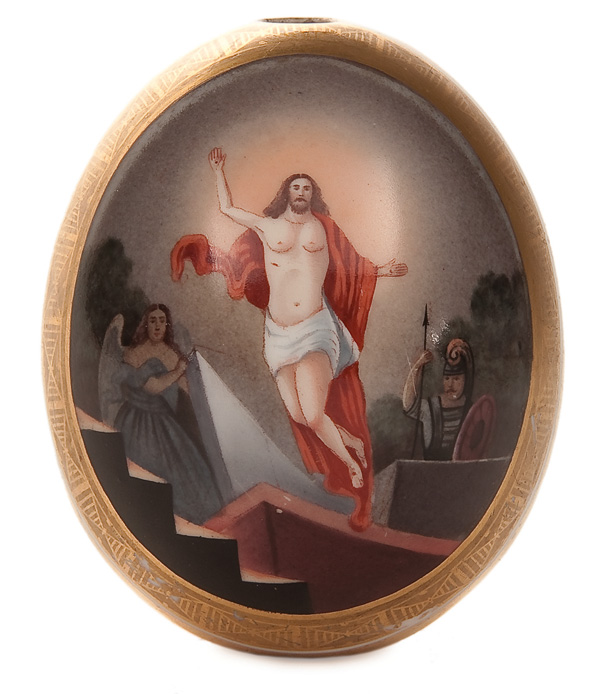 THREE RUSSIAN PORCELAIN EASTER EGGS, CIRCA 1860-1890. Comprising of a finely decorated egg painted with the risen Christ and with burnished and matte gilt decoration, possibly the Imperial Porcelain Factory, Height 3.5 inches (9cm) illustrated. Together with a large 4.25 inch (11cm) egg with three bouquets of flowers painted against a blue ground and a 3 inch (7.5cm) egg inscribed in Cyrillic, 'Christ Has Risen'.