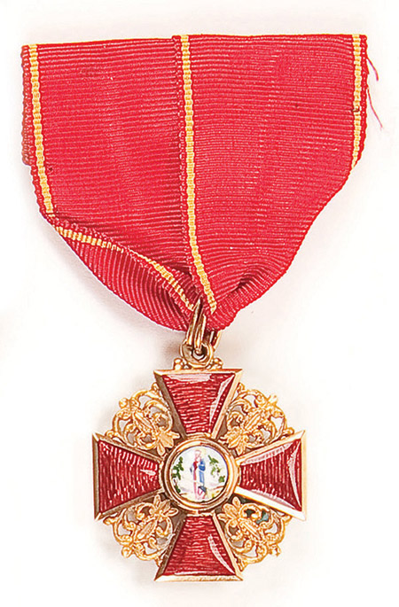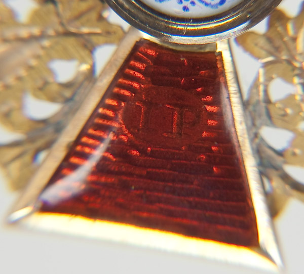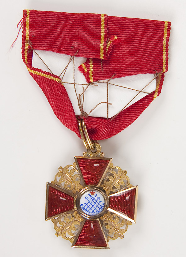 AN IMPERIAL RUSSIAN BADGE, order of St. Anne, 3rd class, gold and enamel, hallmarked St. Petersburg on suspension loop, Latin maker’s mark IP beneath translucent enamel and with Flying Eagle mark. 34 x 34 mm.