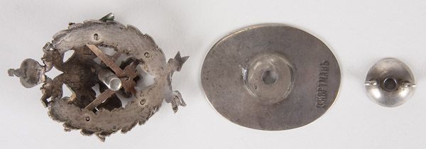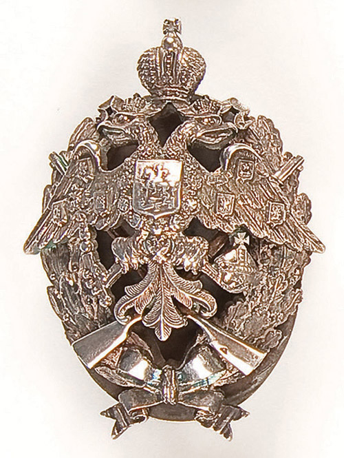 AN IMPERIAL RUSSIAN BADGE, marking the graduation from the officers-shooters school. Hallmarked St. Petersburg 1908-1917, Cyrillic maker mark K.? and 84 silver standard. 58 x 45 mm. Multi-piece screwback construction. Excellent condition. Reference: S.B. Patrikeev l.l.41 p.30.