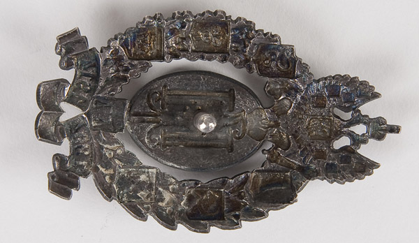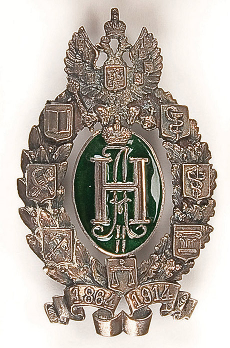 AN IMPERIAL RUSSIAN BADGE, in honor of the fiftieth anniversary of Zemstvo, silver and enamel. Hallmarked Kiev, circa 1908-1917 and unknown makers mark KIA. Missing screw plate. 70 x 40 mm. Reference: S.B. Patrikeev 4.22 p.202.