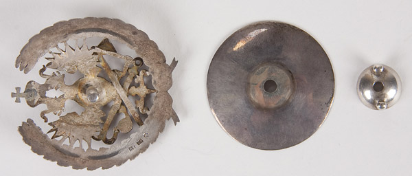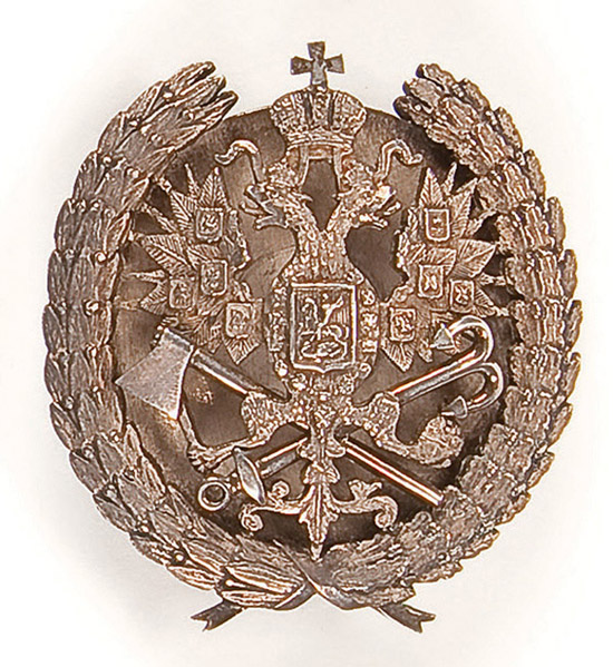 AN IMPERIAL RUSSIAN BADGE, marking the graduation from the Institute of Railway Engineers. Circa 1890’s. Hallmarked St. Petersburg, 84 silver standard and Latin makers mark FB, perhaps Fredrik Bjork. Screw back. 50 x 45 mm. Excellent condition. Reference: S.B. Patrikeev 1.1.12. p16.