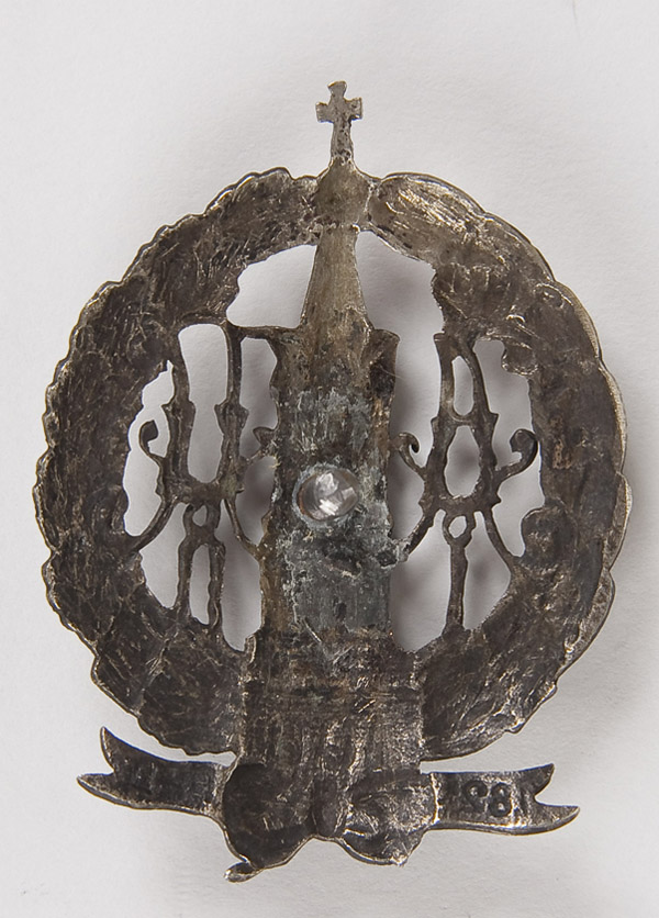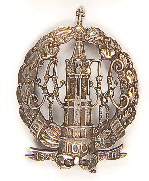 AN IMPERIAL RUSSIAN BADGE, of the 182nd Grokhov Infantry Regiment for a private soldier, silvered metal with screw back. Circa 1915, missing screwplate. 50 x 38 mm. Reference: S.B. Patrikeev 4.2.142. Moderate wear.