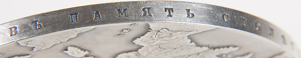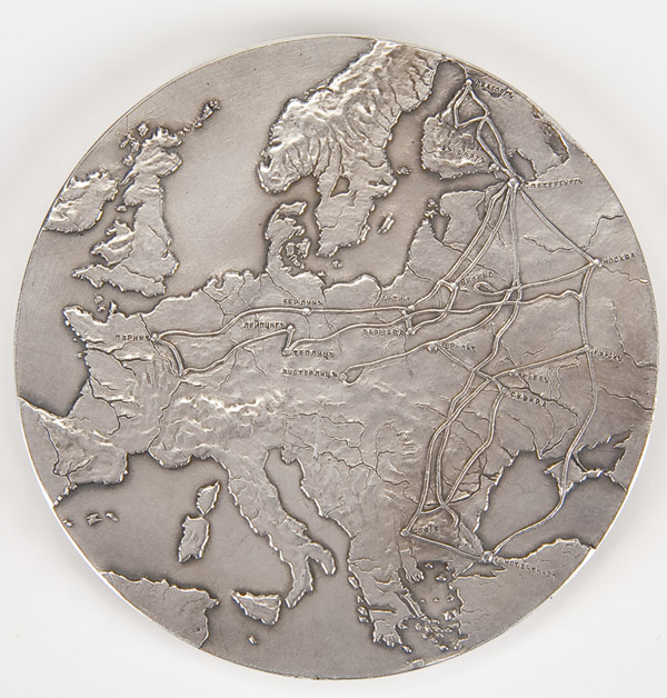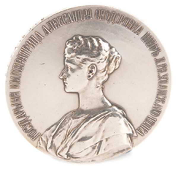 A RARE IMPERIAL RUSSIAN SILVER MEDAL, 1903. Commemorating the 100th Anniversary of L.-G. Ulhan of Her Imperial Majesty Sovereign Empress Alexandra Feodorovna Regiment. The obverse with bust of Empress Alexandra Feodorovna and the verso with map of Europe showing the regiment's campaigns. Diameter 73 mm.