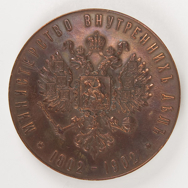 AN IMPERIAL RUSSIAN TABLE MEDAL COMMEMORATING THE CENTENIAL OF THE MINISTRY OF INTERNAL AFFAIRS, circa 1902. Bronze. 71 mm. Fine condition.