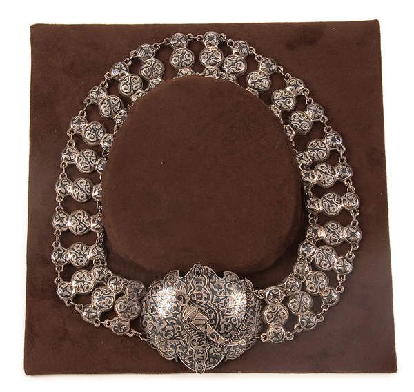 A FINE RUSSIAN SILVER AND NIELLOED LINKED BELT, CIRCA 1896-1908 the buckle with kindjal fastening device and in Cyrillic 'KAVKAZ', hallmarked Kiev, circa 1896-1908 and with Cyrillic makers mark 'Ya. S.' Length 27 inches (68.6 cm).