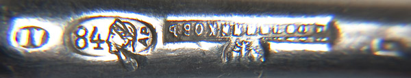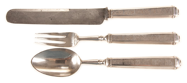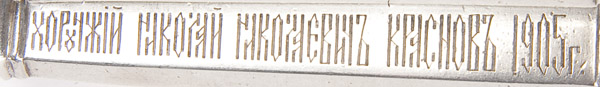 A RUSSIAN SILVER PRESENTATION COSSAK FLATWARE SET, OVCHINNIKOV, 1896-1908. The sturdy matching three piece set with flattened tapering hexagonal handles with domed terminals and ornately engraved in stylized Cyrillic, 'Khorunzhy (Lieutenant) NIKOLAI NIKOLAEVICH KRASNOV 1905' . Hallmarked Kiev, 1896-1908 and stamped in Cyrillic Ovchinnikov beneath the Imperial warrant and 84 standard. Greatest length 10.5 inches (26.5cm).