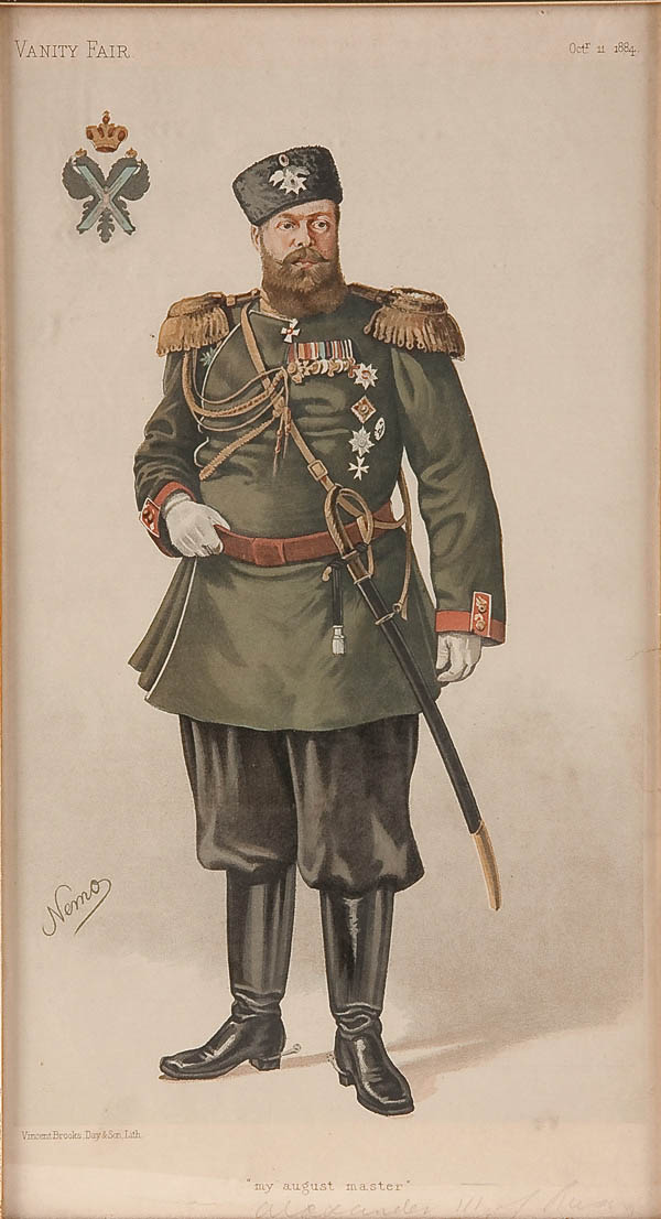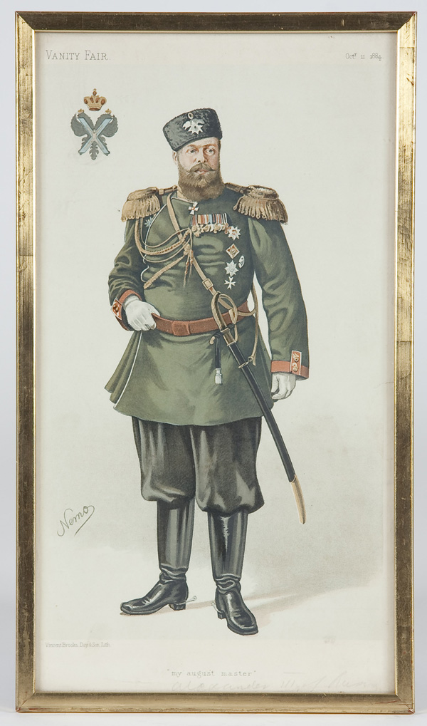 A VINTAGE COLOR LITHOGRAPH PRINT OF TSAR ALEXANDER III Dated October 11, 1894 in glazed gilt frame. Height 14 inches (36 cm), width 8 inches (20 cm).