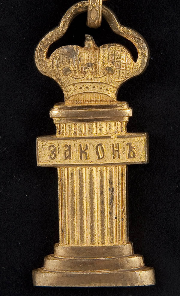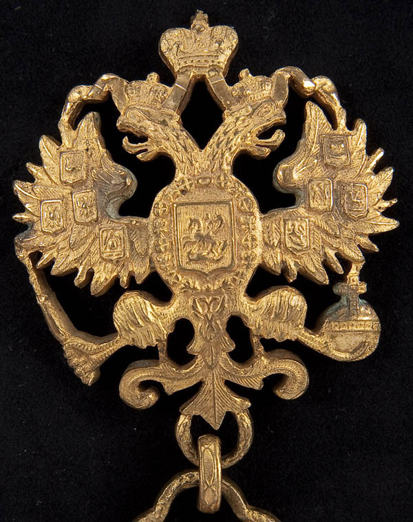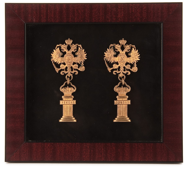 A PAIR OF RUSSIAN GILT-BRONZE IMPERIAL 'LAW' MEDALLIONS, 19TH CENTURY. Comprising a pair of finely crafted Imperial Double Headed eagles with Imperial crowns atop fluted columns suspended beneath. Each column embossed with the word ЭАКОНЪ (law) and mounted on a velvet backing within a glazed frame. Each medallion measuring 5 inches in height (12.8 cm).