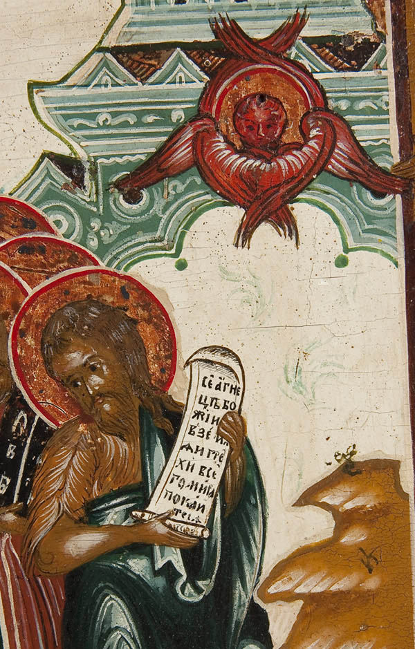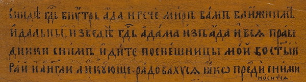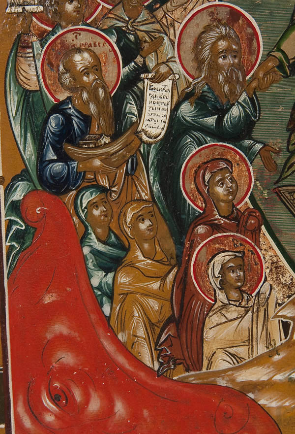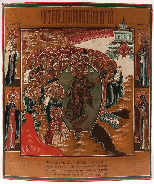 A RUSSIAN ICON OF THE DESCENT INTO HADES, 19TH CENTURY. Here Christ is seen descending into Hades to free the Old Testament righteous men and women held there in captivity as hinted at in 1Peter 3:19 and narrated in the apocryphal Gospel of Nicodemus. Christ is depicted here standing atop the fallen or broken gates of Hades which appear here as crossed ornate rectangular panels. At lower right is the empty tomb (sarcophagus) displaying the burial shroud. Christ is shown grasping the hand of Adam as Eve kneels before him while various other figures, such as Noah (holding a model ark) walk forth from bondage (stepping out of the jaws of the great red monster at lower left) and making their way upwards to the gates of heaven guarded by a red six-winged Seraph illustrated at upper right. The borders with four family saints including The Holy Hieromartyr Pancratius Bishop of Tauromeny (upper left) and the Holy Martyr Paraskeva (lower left). Also The Venerable Alexander Svirskiy (upper right) and the Holy Martyr Evdokia (lower right). The upper margin displaying a highly stylized and condensed inscription which reads, 'The Resurrection of Our Lord and Savior Jesus Christ'. The lower border inscribed essentially with a shortened version of the account from the Gospel of Nicodemus, 'The Lord came into Hades and said 'Peace be unto you Blessed Ones, and the Lord took Adam by his right hand and led him out of Hades and all the Righteous with him ... come into Holy Paradise, and the angels hearing rejoiced....' 14 inches x 12 inches (35.5cm x 30cm).