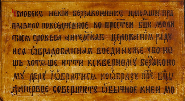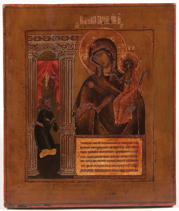 A RUSSIAN ICON OF THE MOTHER OF GOD OF UNEXPECTED JOY, 19TH CENTURY. This interesting Mother of God type about the joy of Divine forgiveness depicts an interior scene in which a man kneels before a large icon of the Mother of God, who holds the child Jesus who bears the wounds of the crucifixion. The tale illustrated is about a man (left) who led a sinful life but was nevertheless devoted to the Mother of God and daily venerated her icon with the words of the of the Archangel Gabriel, 'Hail Mary, full of grace.' One day the man noticed that the Mother of God began to move and the wounds of the crucifixion appeared on the child Jesus and began to bleed. Falling to the floor the man cried out 'O Lady, who has done this?' The image replied, 'You and all who sin crucify my son anew with your sins.' The sinner, full of remorse and contrition, repents, is forgiven and receives a great 'unexpected joy', thus the title for the icon. The lettered panel at lower left is inscribed in Old Church Slavonic with the beginning of the tale, Chelovyek nyekiy bezzakonen imyeyashe pravilo povsednevoe ko presvvyatoye bogoroditsye molitisya slovesem arkangelskago tsyelovaniya…' (A certain lawless man had a daily rule to pray to the most Holy Mother of God with the words of the Archangel Gabriel’s greeting…) Near the head of the kneeling man his words are inscribed 'Oh Lady who has done this?' And written in a strip extending from the mouth of the Virgin is her reply. The title if this icon is inscribed in gilt letters at the top border. In an original state of preservation retaining the original varnish coat. 12.25 inches x 10.5 inches (31 x 26.5cm).