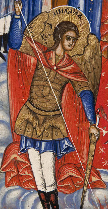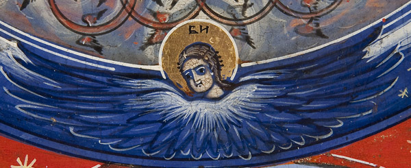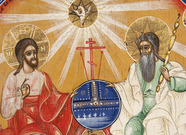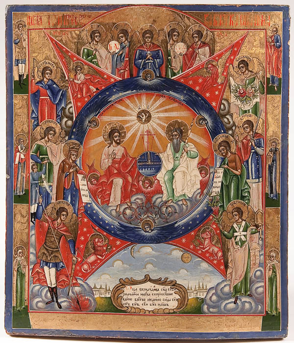 A RUSSIAN ICON OF THE NEW TESTAMENT TRINITY AMONG THE POWERS, 19TH CENTURY. The New Testament Trinity at center upon a four-pointed red star with the symbols of the Four Evangelists at each point. With the Mother of God at left and John the Forerunner at right. The entire image surrounded by the Archangels. The border with six family saints. A colorful, albeit somewhat provincial, icon. 21 inches x 18.25 inches (53.5 x 46.5 cm).