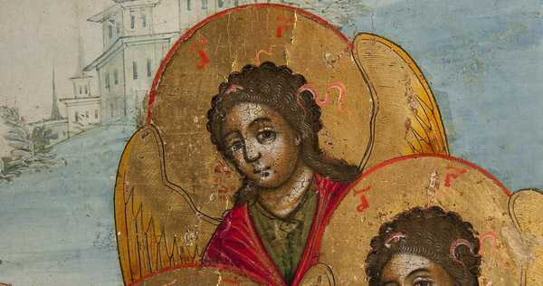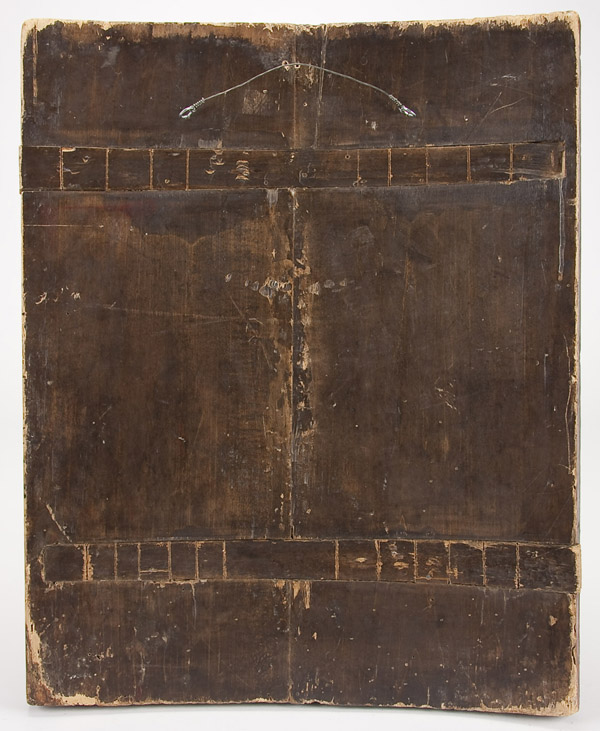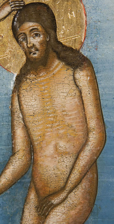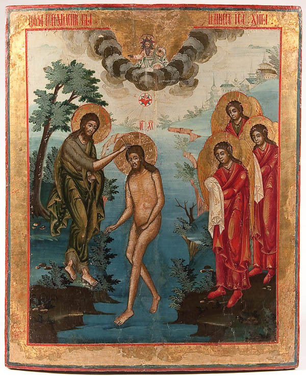 A LARGE RUSSIAN ICON OF THE BAPTISM OF CHRIST, MOSCOW, CIRCA 1800-1825. Here Christ is seen standing in the Jordan River. On the left John the Forerunner baptizes Christ who is attended by three angels of the Lord depicted on the right bank of the river, their hands covered with cloths as a sign of veneration. The Holy Spirit descends from Heaven as a dove within an eight-pointed aureole of light (glory) as God the Father looks on from above. The upper margin inscribed with the title, The Baptism of Our Lord Jesus Christ. 21 inches x 17.5 inches (53.5cm x 45cm).