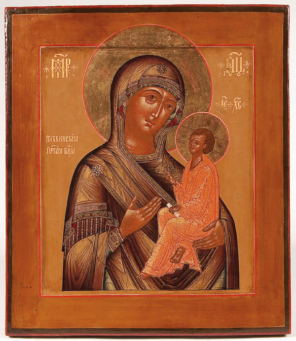 A RUSSIAN ICON OF THE TIKHVIN MOTHER OF GOD, CIRCA 1890. Finely painted with extensive gilt highlights. 14 inches x 12.25 inches (35.5 x 31 cm).