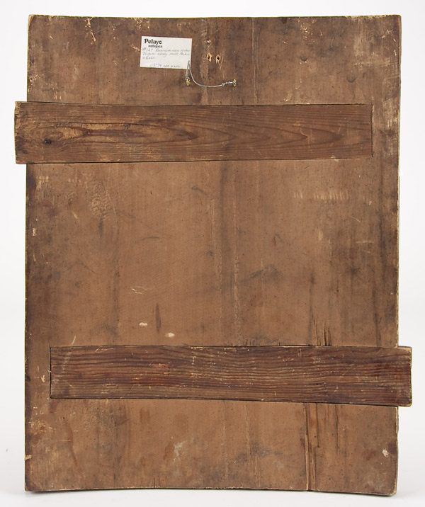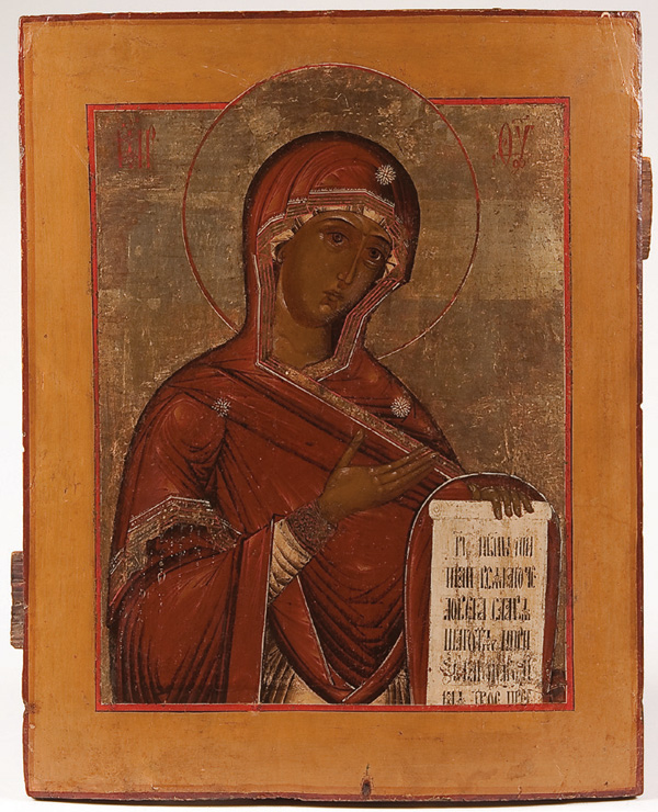 A LARGE RUSSIAN ICON OF THE MOTHER OF GOD, 18TH CENTURY. Being the left panel from a 3-piece Deisis grouping. 20.75 inches x 16.75 inches (53 x 42.5 cm).