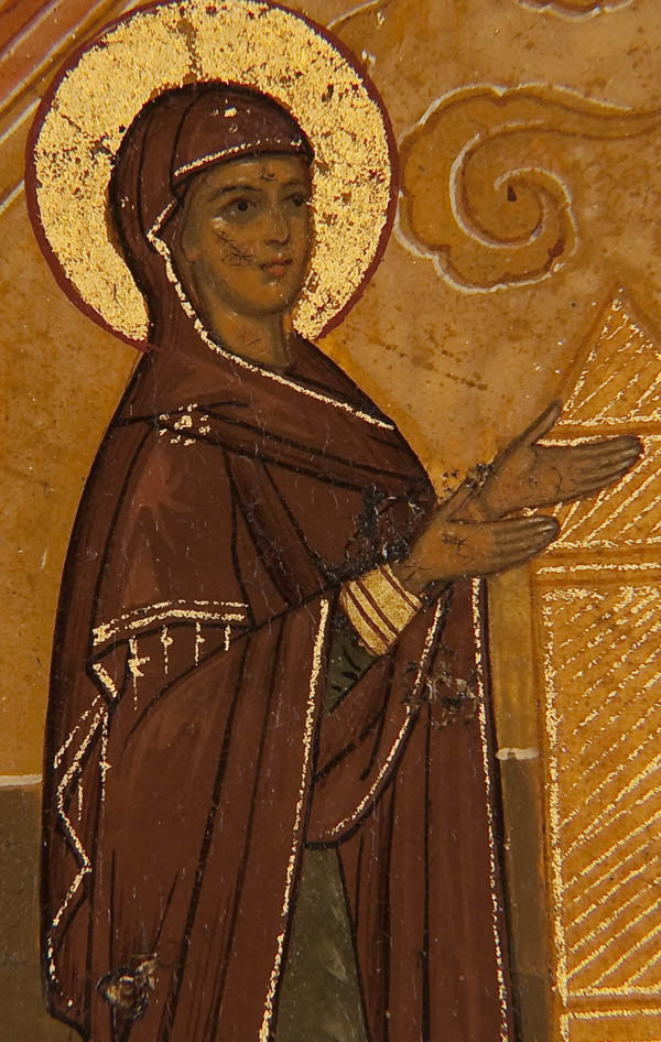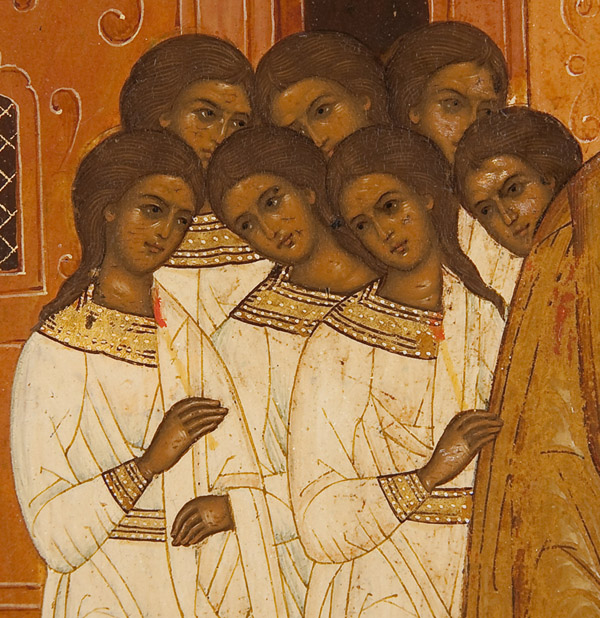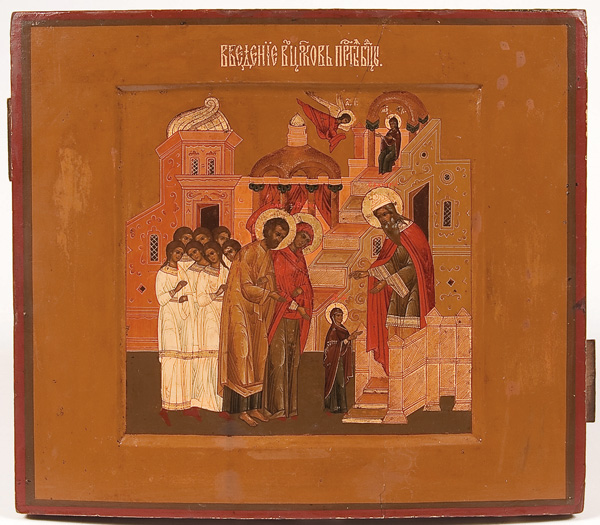 A RUSSIAN ICON OF THE ENTRANCE OF THE MOTHER OF GOD INTO THE TEMPLE, MOSCOW, CIRCA 1890. Here the three year old Mary is presented by her parents Joakim and Anna to the temple priest Zakharias, father of John the Forerunner. In the background a gathering of virgins accompany them. In the upper right corner an angel brings sustenance to the young virgin. The gilt inscription along the top border identifies the image as the VVEDENIE (Entrance) VO (Into) KHRAM (Temple). One of the twelve great festivals, it is celebrated on November 21st (December 4th Western Calendar). 12.25 inches x 14 inches (31cm x 35.5cm).