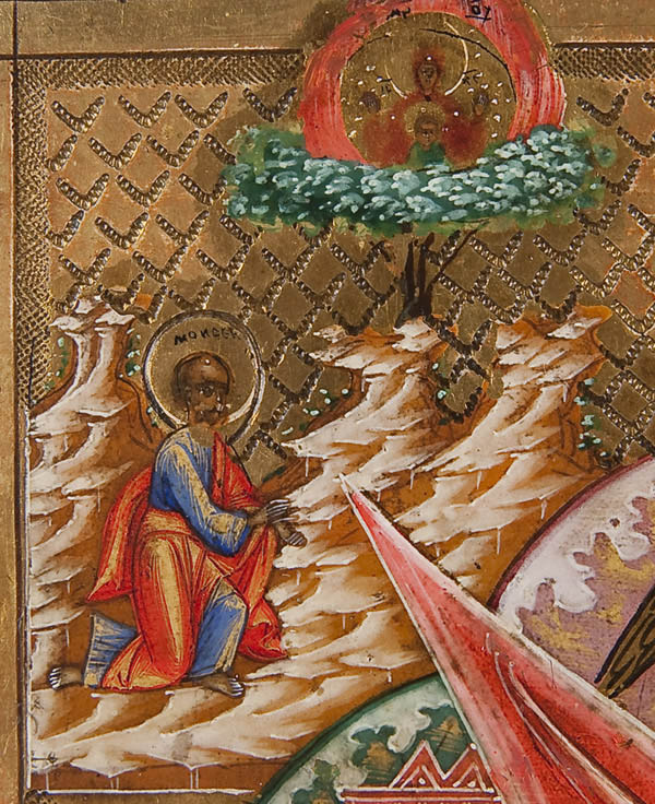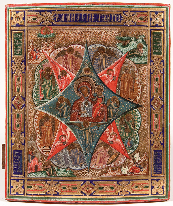A RUSSIAN ICON OF THE UNBURNT THORNBUSH MOTHER OF GOD, CIRCA 1890. Finely painted on an incised gilt ground, the borders painted to simulate champleve enamel. The colorful pallet and stylized clouds, hills and buildings suggest this icon was painted in the village of Mstera. The Unburnt Thornbush icon was used as a form of fire protection. It was used not only to ward off fire from home or building but was also held up to stop a fire once it had begun. In the upper left corner the Prophet Moses see the bush which burns but is not consumed (Exodus 3:2) a prefiguration of the perpetual virginity of the Mother of God who, like the bush which burns but is not consumed, gives birth but remains a virgin (Isaiah 7:14). For a further description of this theme see lot #30. 12.5 inches x 10.6 inches (31.5cm x 27cm).