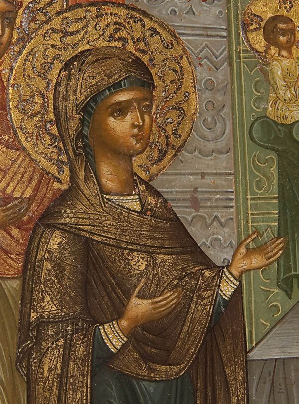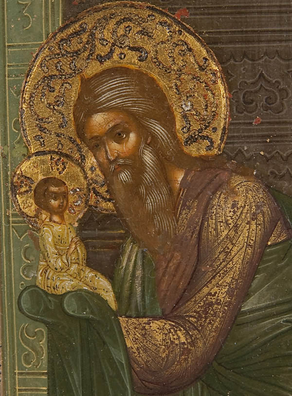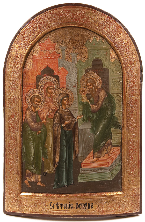 A RUSSIAN ICON OF THE MEETING IN THE TEMPLE, CIRCA 1890. Finely painted on an arched top panel with stippled background and incised gilt borders. 14.5 inches x 10 inches (37 x 26 cm).