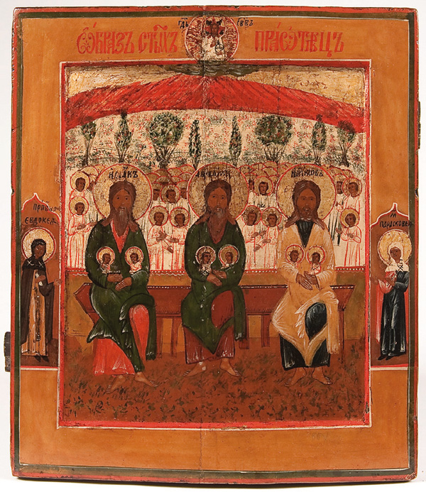 A RUSSIAN ICON OF THE HOLY FOREFATHERS IN PARADISE, 19TH CENTURY. The borders with Saints Evdokia and Paraskeva. 13.5 inches x 11.75 inches (34.5 x 30 cm).