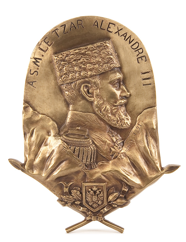 A BRONZE RELIEF PLAQUE OF TSAR ALEXANDER III, FRENCH, Displaying a right facing bust portrait above crossed flags, mounted with a shield displaying the Imperial double headed eagle and with banner incised Paris 1893 and further inscribed 'Toulon 1893 and Cronstadt 1891'. Verso with suspension loop. Height 11.5 inches (29 cm)