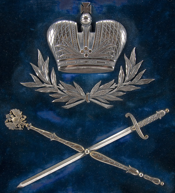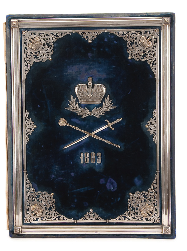 AN IMPRESSIVE IMPERIAL RUSSIAN SILVER MOUNTED CORONATION FOLIO, ST. PETERSBURG, CIRCA 1883. The large rectangular folio covered with blue velvet. The front cover set with a silver repousse and chased crown above crossed sword and gilded silver scepter and the date 1883. The borders with silver strapping and the corners with open fretwork with chased details and set with ornate gilded silver crowns and the back cover set with four silver diamond-shaped feet. The interior lined in white moirE silk. Hallmarked Saint Petersburg, circa 1883, and makers mark G.B. Obviously produced for the occasion of the coronation of Tsar Alexander II in 1883. 22.75 inches x 17 inches (57.5 cm x 44cm).