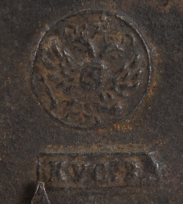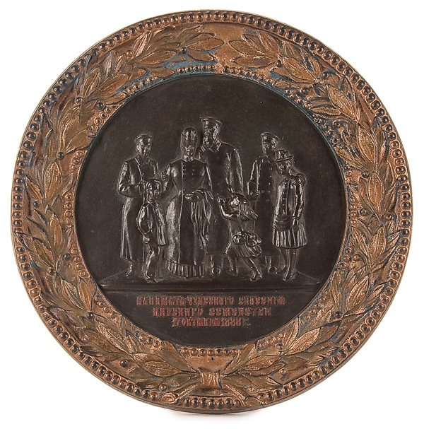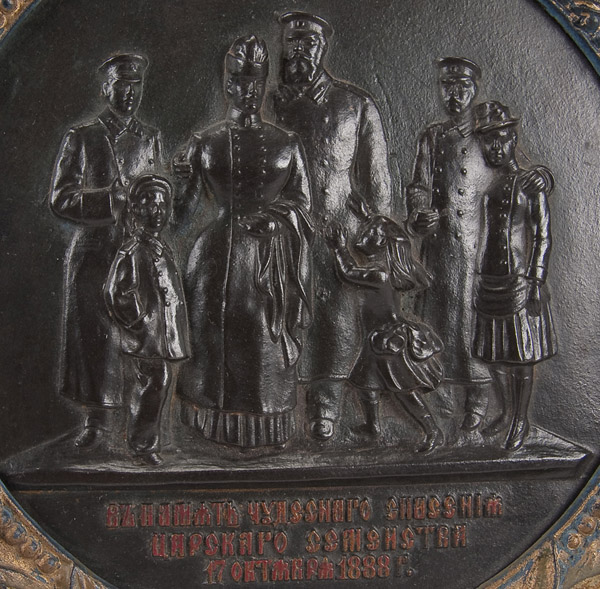 A RUSSIAN CAST IRON PLAQUE COMMEMORATING THE IMPERIAL FAMILY'S ESCAPE FROM HARM IN THE TRAIN ACCIDENT IN BORKI, 17TH OF OCTOBER, 1888 at center a relief sculpted panel of the Emperor and his family, set in a cast frame with laurel leaves, verso with Imperial double headed eagle above the manufacturers name in Cyrillic 'KUS'. Diameter 9.75 inches (25.7 cm)